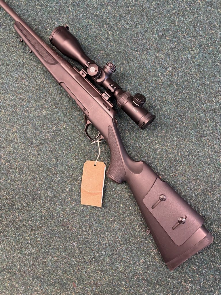 £695/£650 Haenel Jaeger 10 pro 223 bolt action rifle. Black synthetic right hand stock with adjustable comb. RCC Hunter sound moderator. Hawke vantage 3-12×50 scope. Package £695 trade in £650 cash as new condition